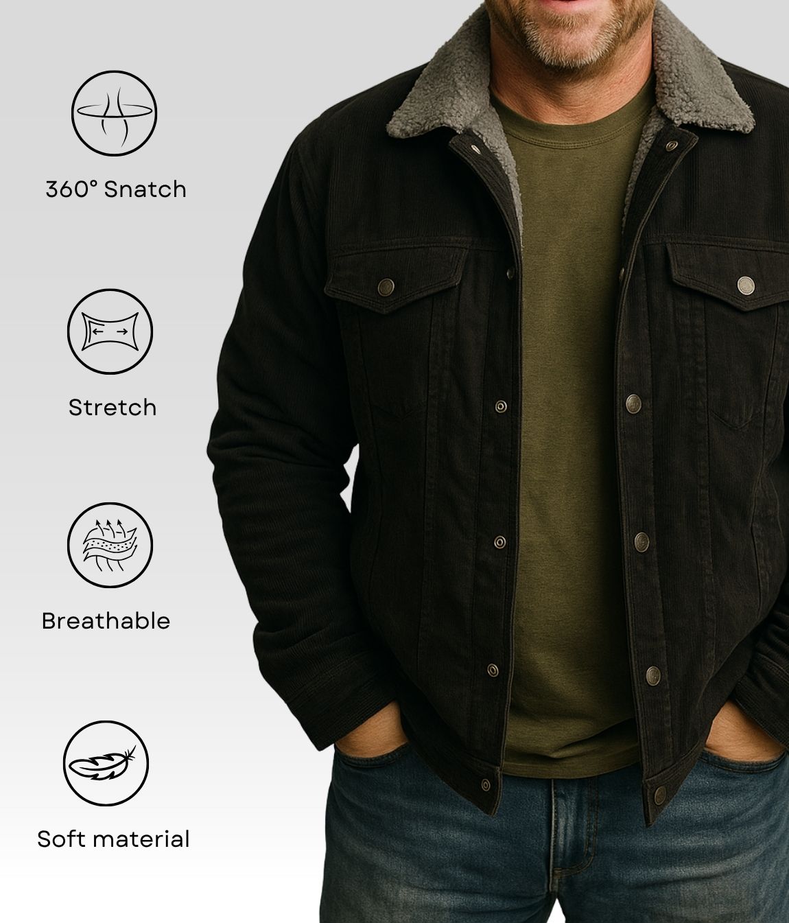 Mit ihrem hochwertigen Cord-Aussenmaterial und dem kuschelig weichen Sherpa-Innenfutter ist sie perfekt für Männer, die Stil, Komfort und Langlebigkeit schätzen.